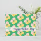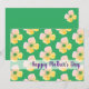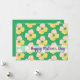Delicadas flores amarillas en un fondo verde con un cartel que dice, "Feliz Día de la Madre". Este diseño de tarjeta plana está en la parte posterior, con un área para añadir el mensaje.