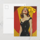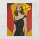 La figura central es una mujer con un comportamiento seguro y agudo. Está mirando hacia arriba, exuberando un aire de elegancia y sofisticación. Su cabello está estilizado de manera clásica y voluminosa, con olas suaves enmarcando su rostro. El color del pelo parece ser cálido, de color marrón dorado. Su maquillaje es dramático y acentúa sus rasgos, con labios rojos audaces, ojos definidos y una apariencia pulida que complementa la vibra general retro o vintage.
