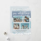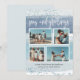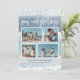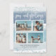 La tarjeta de vacaciones de estilo costero de moda añade un toque náutico a tus saludos navideños. Perfecto para compartir fotos de vacaciones, o para familias que viven en lugares costeros, tropicales, cálidos o isleños, este elegante diseño cuenta con cuatro fotos en un diseño de collage, sobre un fondo de rayas de color azul y verde marino, con falso purpurina azul en la parte superior e inferior. "Mares y saludos" aparece en la parte superior con letras blancas escritas a mano, con el saludo de su personalizado y/o los nombres en la parte inferior.