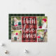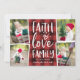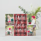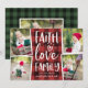 La tarjeta de fotos de vacaciones rústica y festiva presenta cuatro fotos en un diseño de collage, con "fe, amor, familia" en tipografía con letras de mano blanca sobre un fondo de manto rojo y negro de búfalo pintado a mano. Personalice con sus nombres debajo y agregue una foto adicional a la parte posterior sobre un fondo con estampado verde.