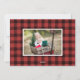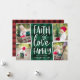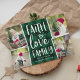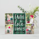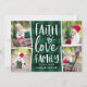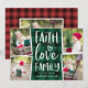 La tarjeta de fotos de vacaciones rústica y festiva presenta cuatro fotos en un diseño de collage, con "fe, amor, familia" en tipografía con letras de mano blanca sobre un fondo de manto verde cazador y negro de búfalo. Personalice con sus nombres debajo y añada una foto adicional en la parte posterior sobre un fondo con estampado rojo.