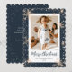 Cuta foto azul de la tarjeta navideña Merry con copos de nieve, estrellas y caída de nieve. Personaliza fácilmente esta tarjeta azul de vacaciones con tu foto y texto.