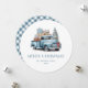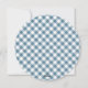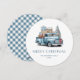 Camión azul Tarjeta navideña con un patrón de manto de gingham azul claro en la parte trasera.