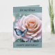 Tarjeta de cumpleaños editable con una hermosa rosa rosa rosa y mariposa azul. Texto editable.