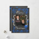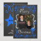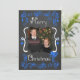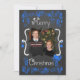 Un fondo de pizarra con hermosos rollos y estrellas de brillante texto azul y blanco que dice "Feliz Navidad" delante y "Que todos tus días sean alegres y brillantes" detrás. Esta hermosa tarjeta personalizada de fotos navideñas de vacaciones tiene varios adornos estelares, y un pájaro en un diseño de nido y áreas que puedes fácilmente agregar tus nombres, el año actual, y foto!