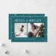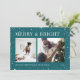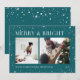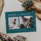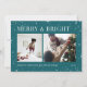 Un diseño moderno y festivo para tus saludos de vacaciones con dos fotos alineadas una al lado de la otra, sobre un vibrante fondo verde azulado salpicado de estrellas. "Merry and Bright" aparece al otro lado de la parte superior en letras clásicas del serif, con "Season's Greetings" tu apellido, y el año a lo largo del final. Un diseño alegre y colorido para los Navidades 2021.