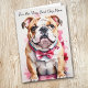 Esta tarjeta linda para el Bulldog de mamá o papá hace una gran tarjeta de El día de San Valentín, pero también puede ser usada para un cumpleaños o cualquier otra ocasión especial. Todo el texto se cambia fácilmente a lo que quieras. El frente tiene una imagen de un adorable Bulldog marrón y blanco con una corbata rosada y un fondo abstracto detrás de él. El interior dice actualmente "Me haces la cola WAG".