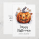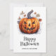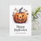 Tarjeta acuarela de Halloween con calabaza espeluznante y hojas de otoño. Personaliza fácilmente esta minimalista tarjeta de Halloween con tu nombre y texto familiar.