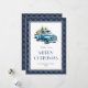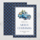 Funda azul de búfalo en la tarjeta de Navidad Merry con un camión retro azul. Personalice fácilmente esta nevada tarjeta de vacaciones con su nombre familiar y el año.