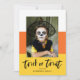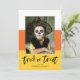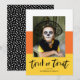 Desee a sus amigos y familiares una Feliz Halloween enviándoles nuestra linda tarjeta de fotos de Halloween de Candy Corn. La divertida tarjeta de Halloween incluye rayas de color maíz dulce con las palabras "Trick or Treat" en escritura negra con letras a mano. Personalice las tarjetas únicas de Halloween agregando una foto, sus nombres u otro texto personalizado. El reverso presenta un diseño de puntos en blanco y negro.