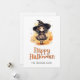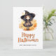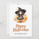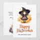 Carta feliz de Halloween con un ilustracion acuarela de una pequeña bruja en un gorra, calabazas y fantasmas. Personaliza fácilmente esta linda tarjeta de Halloween para los niños con tu apellido y texto.