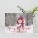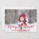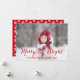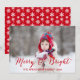Envíe esta sencilla, elegante, versátil, letra de guión, tarjeta fotográfica "Merry and Bright" para las vacaciones. Sobreposición de texto del guión rojo Elke Clarke© Red. Para otros colores, póngase en contacto con el almacén. Hermoso patrón blanco de copos de nieve con color de fondo rojo en la parte posterior de la tarjeta.