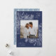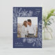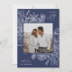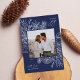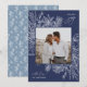 Una tarjeta de vacaciones moderna y elegante que enmarca tu foto cuadrada en un marco muy cuidado con rodajas de cítricos, anís estrellado y ramos de pino sobre un rico fondo azul. "Alegría de vacaciones" aparece en la parte superior derecha, con el nombre de su familia en la parte inferior. El año se ubica elegantemente en la parte inferior izquierda del marco botánico blanco muy detallado. Una delicada y refinada elección inspirada en la naturaleza para sus Navidades 2021 cartas.