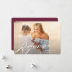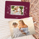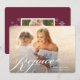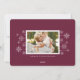 Simple y elegante tarjeta de foto de vacaciones con su foto horizontal o apaisada favorita en sangrado total con "Rejoice" superpuesto en letra de caligrafía blanca tradicional. Personalice con sus nombres y el año junto. Luego agregue una foto adicional y un mensaje personal en la parte posterior si lo desea, en un rico fondo de ciruela burdeos acentuado con pequeños copos de nieve blancos.