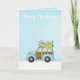 El auto de madera que va a casa desde el lote de árboles de Navidad. Este es un gran diseño para cualquier bienvenida estacional o transferencia a cualquier producto con un fondo azul cielo y un suelo cubierto de nieve. Diseño divertido, caprichoso y colorido para cualquiera.