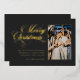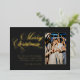 Un diseño elegante con "Feliz Navidad" en un guión ornamentado de caligrafía y Relieve metalizado dorado. El color de fondo es gris oscuro y es personalizable. El marco alrededor de la imagen, y el mensaje personalizado con el nombre de la pareja debajo, también están en Relieve metalizado dorado. (Se puede elegir entre diferentes Relieves metalizados de color).