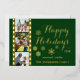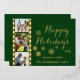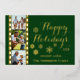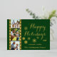 Tarjeta de foto de Navidad con tira de película de cámara antigua con foil real, fondo verde cedro con tipografía dorada elegante de "Felices Fiestas" y tres fotos familiares, fácilmente personalizable con las tuyas.