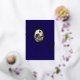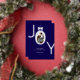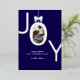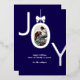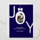 Tarjeta de vacaciones de hoja de plata JOY Real con la palabra JOY con tu foto familiar favorita dentro de la O hecha para parecer un adorno con un lazo en la parte superior. Fondo azul marino con letras de hoja de plata real hace que esta sea una felicitación navideña elegante y moderna que tus amigos y familiares estarán encantados de recibir.