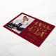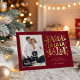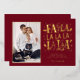 Toca un acorde verdaderamente alegre con esta tarjeta de foto festiva única que canta alegría navideña. El rico fondo rojo borgoña sirve como escenario para el mensaje "FA LA LA" juguetón y de gran tamaño, que brilla intensamente en hojalata dorada de lujo. Las notas musicales dispersas y los íconos festivos, también en hojalata dorada, enmarcan la foto de su familia de manera hermosa, lo que hace que esta sea una anuncio divertido, vibrante e inolvidable.