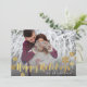 Una hermosa tarjeta de foto con copos de nieve de oro y "Felices Fiestas" en una fuente de letra dibujada a mano, también adornada con una textura de lámina dorada. Simplemente agrega tu propia foto y personaliza el nombre y el año en la parte frontal de la tarjeta. En la parte inferior de la tarjeta de foto en el frente hay un degradado, para que el texto se muestre en fotos más claras... sin embargo, puedes eliminarlo si lo deseas. La parte trasera de la tarjeta está llena de hermosos copos de nieve de lámina dorada.