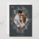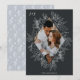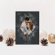 Una tarjeta de vacaciones moderna y elegante que enmarca tu foto vertical o orientada a retratos en un marco con forma de diamante muy detallado con hojas huecas, bayas y hojas de invierno sobre un rico fondo negro suave. "JOY" aparece en la parte superior izquierda, con el nombre de su familia en la parte inferior. El año está enmarcado elegantemente en el marco botánico blanco muy detallado. Una delicada y refinada elección inspirada en la naturaleza para sus Navidades 2021 cartas.