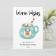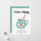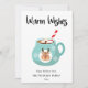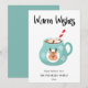 Deseos cálidos, adorable tazón azul de cacao caliente con copos de nieve, reno, malvaviscos y paja. Parte posterior de las funciones de la tarjeta, color azul helado sólido de coordinación.