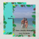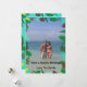 La tarjeta de Navidad de tema tropical de playa presenta tonos de verde y amarillo y proclama "¡Disfruta unas vacaciones en la playa!". Tarjeta de vacaciones divertida y festiva.