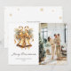 Elegante foto de la tarjeta navideña Merry con un ilustracion acuarela de campanas de Navidades dorados en la parte delantera y copos de nieve en la parte trasera. Personaliza fácilmente esta tarjeta festiva con tu foto y texto.