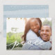 Comparte saludos de vacaciones con estas tarjetas de fotos navideñas de moda que incluyen tu foto horizontal o orientada al paisaje de sangrado completo favorita. "Paz" aparece como un texto blanco sobre la elegante tipografía con letras a mano. Personaliza con tus nombres y el año que pasa abajo. Las tarjetas se convierten en rayas de color azul pastel de hielo con una capa superficial de nieve.
