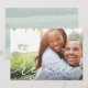Comparte saludos de vacaciones con estas tarjetas de fotos navideñas de moda que incluyen tu foto horizontal o orientada al paisaje de sangrado completo favorita. "Regocijarse" aparece como un texto blanco sobre una elegante tipografía con letras a mano. Personaliza con tus nombres y el año que pasa abajo. La carta se transforma en rayas de color verde pastel con un rebosante de nieve.