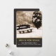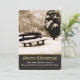 Bonita tarjeta de saludo de Navidades de estilo plano, con una escena de nieve invernal de un banco y un pino hecho con un filtro de sepia. Un fondo marrón oscuro, en la parte inferior de la tarjeta, tiene un texto gráfico de tono dorado que lee Feliz Navidad, y texto personalizado blanco listo para personalizar. Hay productos que coinciden.