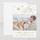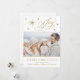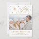 Elegante Tarjeta De Navidades De Alegría Con Guión. Envíe hermosos saludos familiares con esta elegante tarjeta de Navidades azules y plateados. Esta carta presenta la hermosa Joy guionada a mano en oro, rodeada de estrellas doradas y plateadas. Añade fácilmente tu foto familiar o recién nacido en lugar de la foto de stock, para un toque personal.