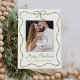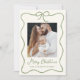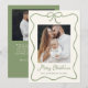 Celebre la temporada con nuestra tarjeta de vacaciones de fotos con crema y cinta verde 2. Este encantador diseño muestra tu preciada foto familiar rodeada por un festividad de cinta verde, con un arco en la parte superior. El fondo crema destaca maravillosamente el saludo escrito a mano "Feliz Navidad" en escritura verde, que puede ser personalizado con un saludo de su elección. Añade tu apellido para un toque personal. En la parte trasera hay espacio para una segunda foto y un mensaje sincero. ¡Ideal para compartir la alegría con los seres queridos esta temporada de vacaciones!