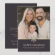 Añada un toque de elegancia a sus saludos de vacaciones con esta elegante tarjeta de vacaciones plana de fotos familiares. En la parte delantera se puede ver una foto de la familia adornada con un delicado motivo de copo de nieve. Voltea hacia atrás para ver un impresionante fondo oscuro mostrando un sentido mensaje de vacaciones: "Que la magia de la temporada llena tu corazón de alegría, y que tus días sean alegres y brillantes. Deseando que ames, risas y momentos apreciados con tus seres queridos. Con cálidos deseos y gratitud, (firma familiar)". Esta tarjeta captura la esencia de las vacaciones con su diseño de personalizable que irradia calor y alegría.