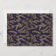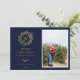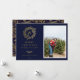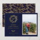 Monograma elegante de pino dorado de invierno, tarjeta de foto de vacaciones en azul festivo. Características de la tarjeta que coinciden con el respaldo de patrón dorado y múltiples líneas de plantilla para el saludo de su personalizado.