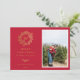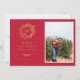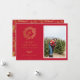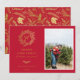 Elegante monograma dorado de pino de invierno, tarjeta fotográfica de vacaciones en rojo festivo. Características de la tarjeta que coinciden con el respaldo de patrón dorado y múltiples líneas de plantilla para el saludo de su personalizado.