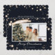 Elegante foto azul de Feliz Navidad con estrellas en un fondo azul oscuro adornadas con caída de nieve. Personaliza fácilmente esta tarjeta de vacaciones estrellada con tu foto, nombre de familia y texto.