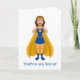 Personalizable gracias por la tarjeta de saludo con el ilustracion de una sonriente superheroína mujer vestida con traje azul y amarillo con una falda y una capa, con el título de texto "Eres mi héroe", los campos de texto pueden ser personalizados para satisfacer tus necesidades