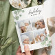 Comparte saludos de vacaciones con estas tarjetas de collage de fotos de Navidades de moda con cuatro de tus fotos cuadradas favoritas enmarcadas en la parte superior e inferior por hojas de eucalipto pintadas en verde jaula pastel. Los "deseos de vacaciones" aparecen en la parte superior derecha en una elegante mezcla de caligrafía y letras modernas, y el año está cuidadosamente metido en una de las hojas. Personalice el nombre de su familia en la parte inferior izquierda.