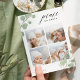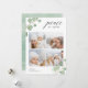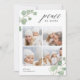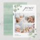 Comparte saludos de vacaciones con estas tarjetas de collage de fotos de Navidades de moda con cuatro de tus fotos cuadradas favoritas enmarcadas en la parte superior e inferior por hojas de eucalipto pintadas en verde jaula pastel. "Paz en la Tierra" aparece en la parte superior derecha en una elegante mezcla de caligrafía y letras modernas, y el año está cuidadosamente metido en una de las hojas. Personalice el nombre de su familia en la parte inferior izquierda.