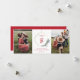 Una moderna tarjeta fotográfica de vacaciones para Navidades que incluye un monograma familiar inicial, dos aperturas fotográficas verticales o retratos con una corona de alambre de oro y una franja de vacaciones asimétricas con ramas de pino, ciprés y bayas sobre un fondo blanco nevado.