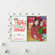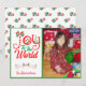 Envía esta tarjeta de vacaciones brillante y colorida a tus amigos y familiares y pon una sonrisa en sus rostros. El diseño presenta tipografía que dice "Alegría al mundo" y la palabra Alegría está festivamente decorada en rojo, dorado y verde con adornos, lazo y árbol de Navidad. Sube tu foto favorita de familia o de niño y personalízala con tu nombre y listo. El reverso de la tarjeta tiene un patrón de bastón de caramelo en purpurina (falsa) brillante. Muchos más diseños en mi tienda en www.zazzle.com/digiscrapthat