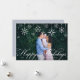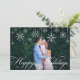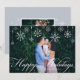 Un diseño elegante y clásico de tarjetas de vacaciones con una foto horizontal o orientada hacia el paisaje, con un borde de copos de nieve en la parte superior. "Felices Fiestas" aparece en el guión tradicional de caligrafía. Personalice el nombre de su familia y el año con letras blancas en la parte inferior derecha, y añada una segunda foto en la parte posterior.