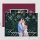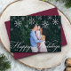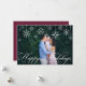 Un diseño elegante y clásico de tarjetas de vacaciones con una foto horizontal o orientada hacia el paisaje, con un borde de copos de nieve en la parte superior. "Felices Fiestas" aparece en el guión tradicional de caligrafía. Personalice el nombre de su familia y el año con letras blancas en la parte inferior derecha, y añada una segunda foto en la parte posterior.