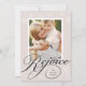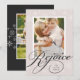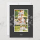 Elegante tarjeta fotográfica navideña presenta un suave fondo de color azul cameo salpicado de festivos copos de nieve blancos, con tu foto favorita vertical o orientada a retratos enmarcada por un borde blanco. "Regocijo" aparece en la parte inferior de la escritura caligráfica tradicional, con el nombre de tu familia escondido en el diseño, en gris carbón rico. Personalice el fondo gris oscuro con tres fotos adicionales y un saludo de Navidades personalizados.