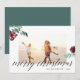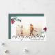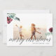 La tarjeta fotográfica navideña sencilla y de moda incluye su foto familiar favorita enmarcada por una espesa frontera blanca, con "Feliz Navidad" colocada en la parte inferior en letras modernas de caligrafía. Flores acuáticas y vegetación en rojo y verde festivo completan el diseño. Personalice su nombre y el año de abajo a la derecha. Las tarjetas cambian a verde picante sólido.