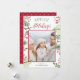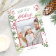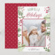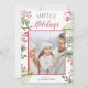 La tarjeta de fotos festiva incluye bayas de color de agua pintadas, hojas y ramas, rodeando tu foto favorita en el centro. "Festividades más felices" aparece en la parte superior en tipografía de bloques con letras rojas y verdes. Personalice el saludo de su personalizado y los nombres que aparecen en la parte inferior.