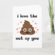 Una tarjeta El día de San Valentín divertida, linda y traviesa con que me encanta la mierda de ti, con una emoji de caca tibia rodeada de corazones en lugar de moscas.
