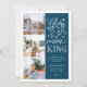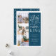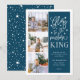 La hermosa tarjeta fotográfica basada en tipografía muestra tres de tus fotos familiares favoritas en formato cuadrado a lo largo del lado izquierdo. "Gloria al recién nacido rey" aparece a la derecha en una tipografía con letras a mano blanca sobre un fondo azul verde azulado oscuro salpicado de estrellas festivas. Personalizar con su saludo personal, nombres de familia, nombres individuales y el año. Las tarjetas se revierten a un patrón de nieve blanca y estrellas en un fondo coincidente.