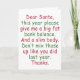 Graciosa tarjeta de Navidades de Santa con un gracioso dicho: "Querido Santa, este año por favor den un gran balance bancario. Y un cuerpo delgado. No los mezcles como el año pasado. Gracias".
